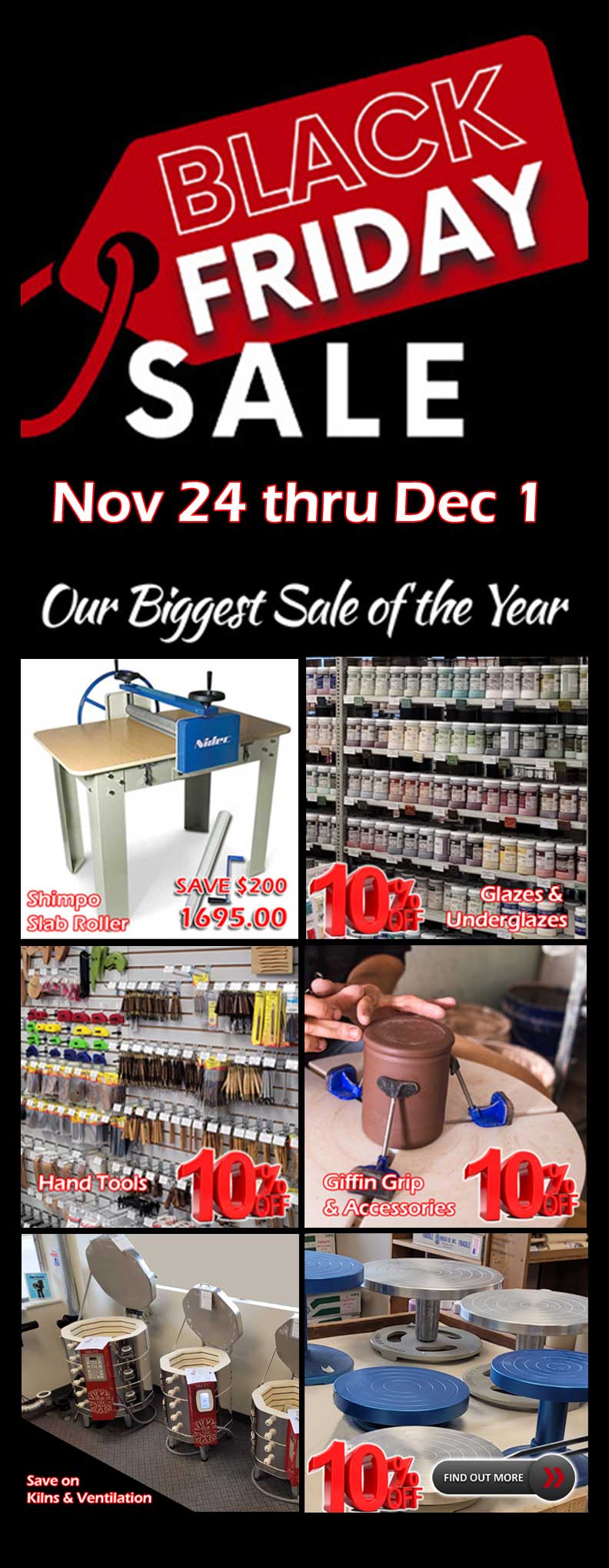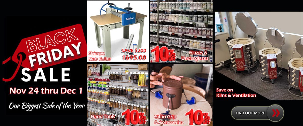 Stocking hundreds of glazes, clays , hand tools, kilns, pottery wheels, stains, banding wheels, slabrollers, pugmills. Everything for your pottery and ceramic needs.