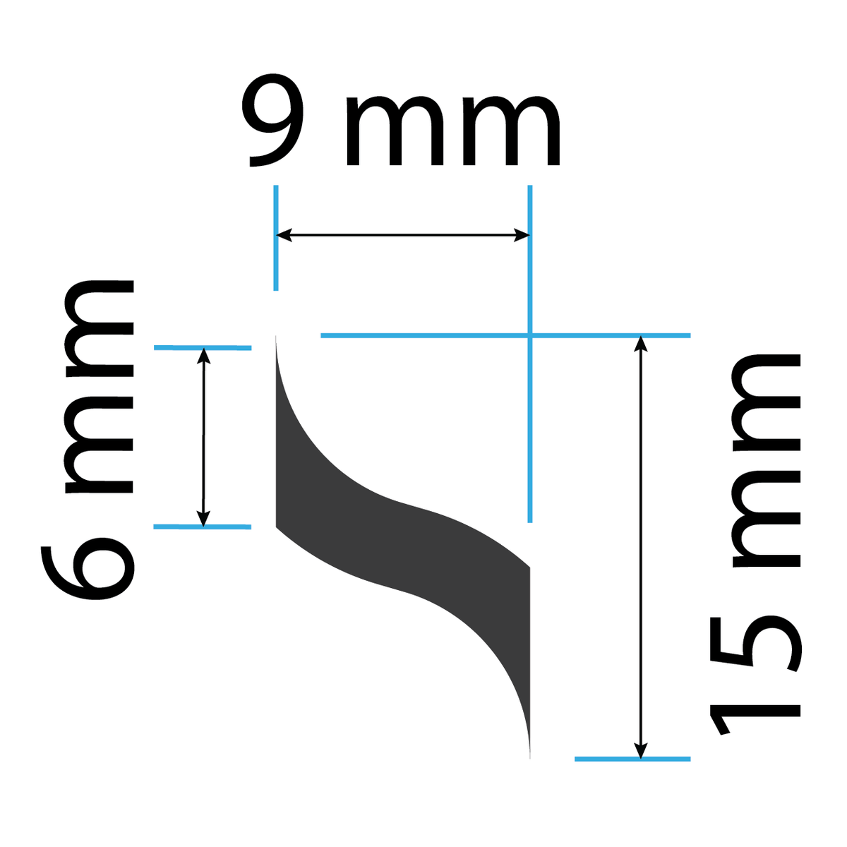 - Impression tip: approximately 15 mm long, 9 mm wide, S-curve from top left to bottom right
