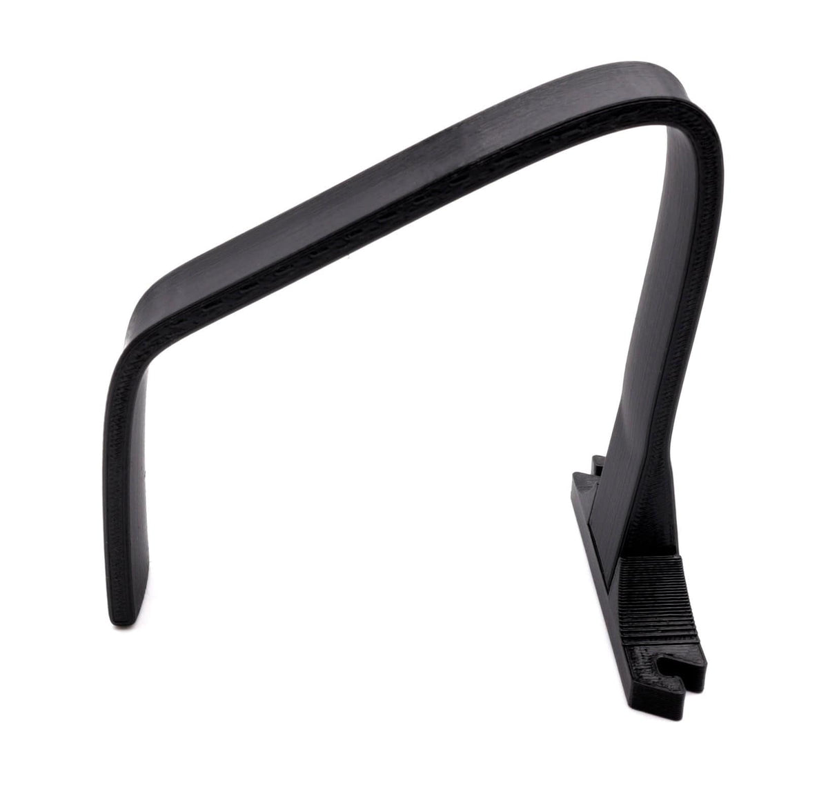 - Black plastic handle form; single curve with flatter top, angled lower half