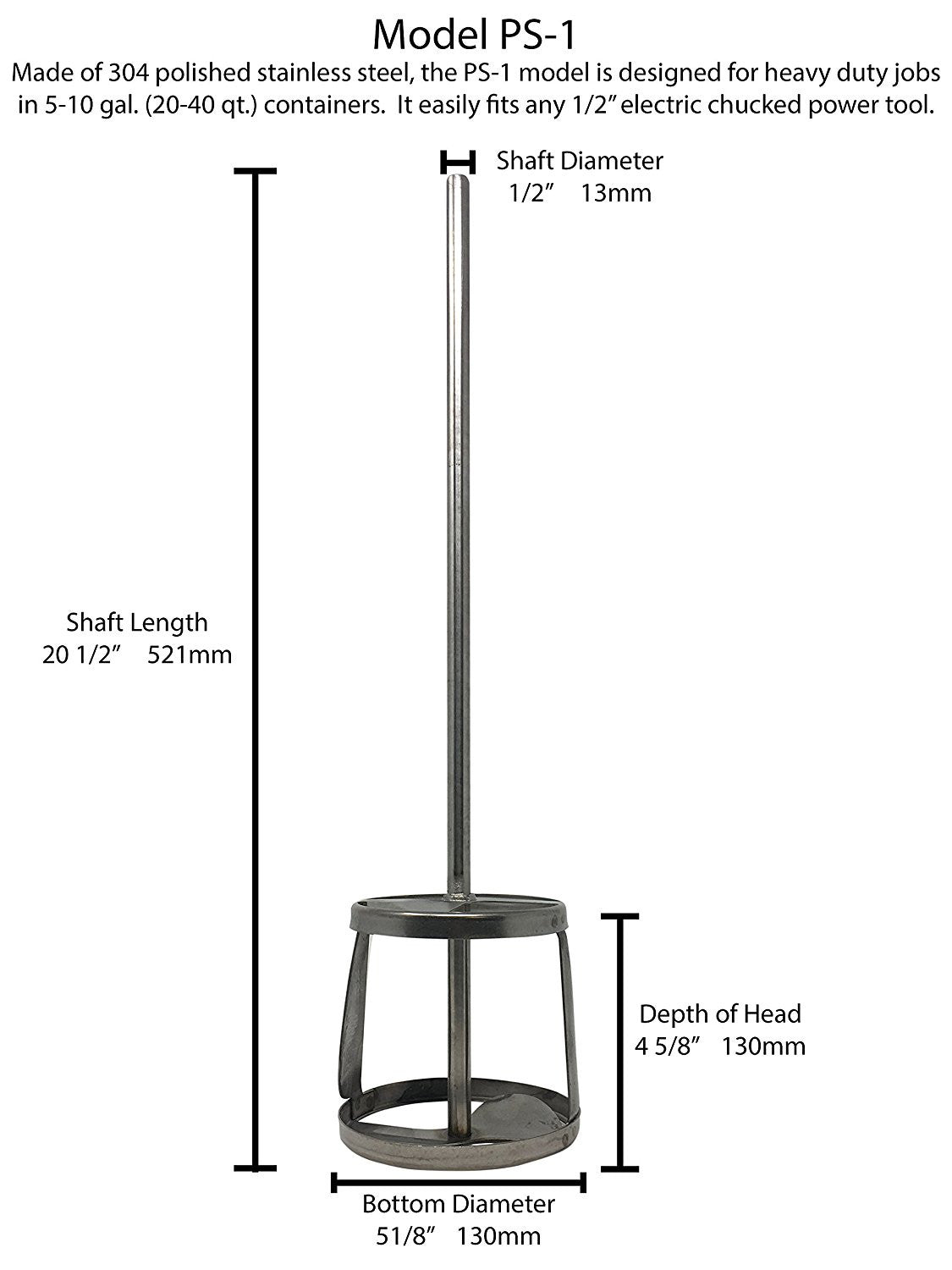 The Jiffy Mixer model PS-1 stainless steel mixing blade attaches to a power drill to mix quantities of liquids between 5 and 10 gallons. Shaft Diameter - 1/2", length - 20 1/2", head diameter - 5 1/8"