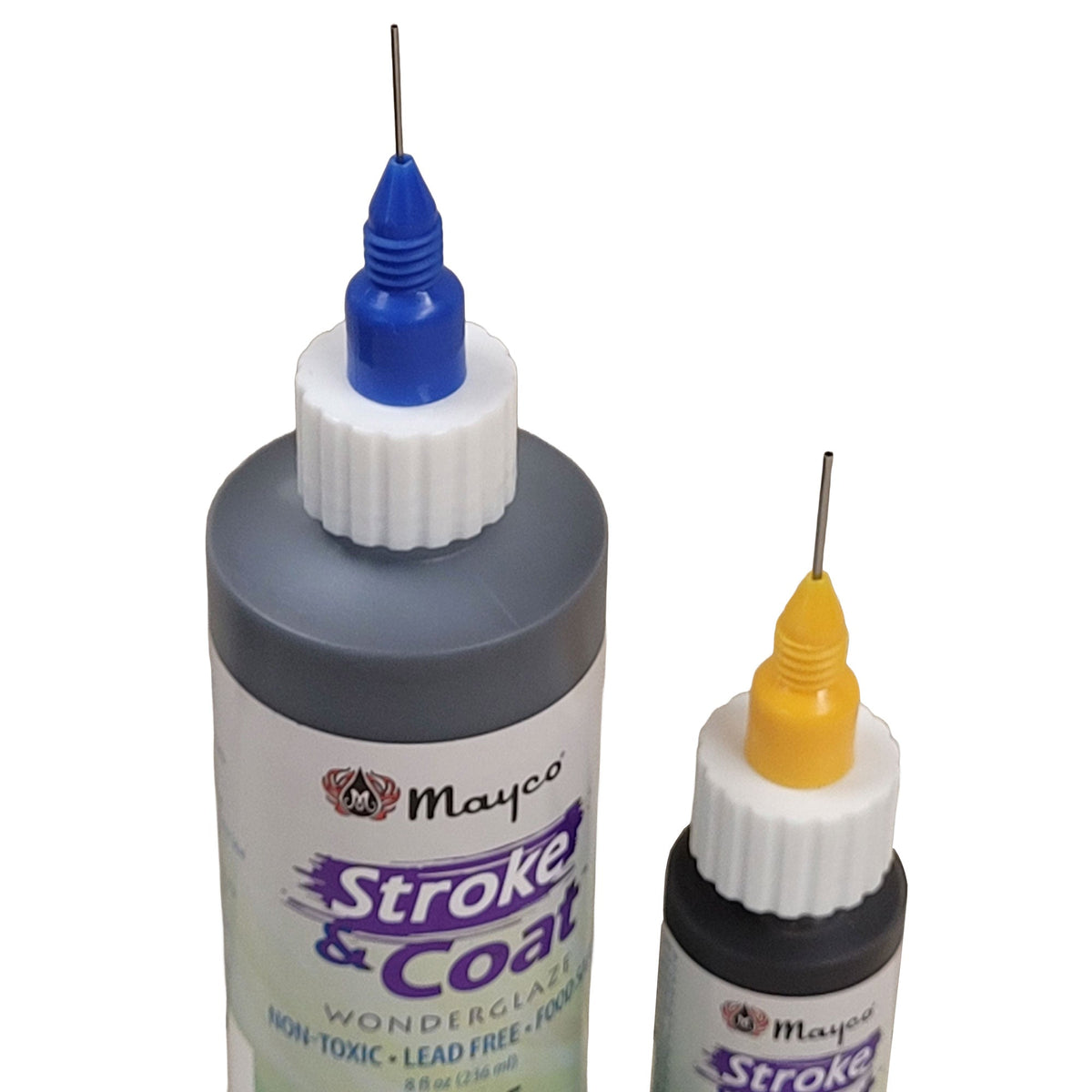 These applicator tips are a direct fit for Mayco Stroke and Coat 2 oz, 8 oz and Pint bottles. They also fit all Mayco 2 oz Softees Acrylic bottles and Duncan 2 oz and 8 oz Bisque Stain bottles.