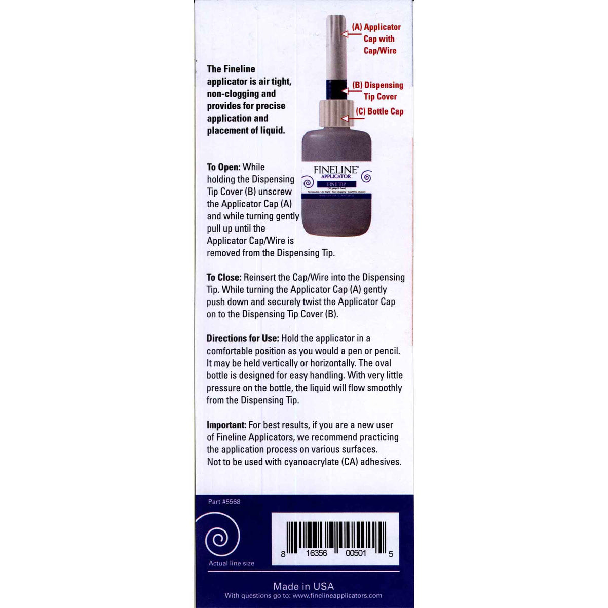 FineLine Applicators are the first precision applicators that use an air-tight non-clogging cap wire closure system to ensure that the applicator and your preferred medium are always ready for immediate use. The Fineline Applicators comes with an 20 gauge (.5mm) stainless-steel dispensing tip. The dispensing bottle is an oval 1.25 ounce low-density polypropylene bottle with an 18/410 threaded neck.