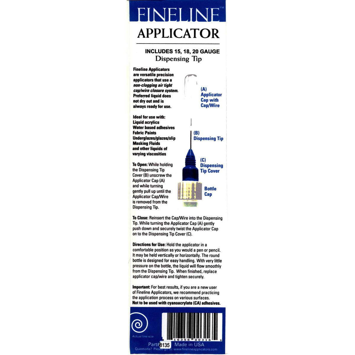 FineLine Tube Applicators are the first precision applicators that use an air-tight non-clogging cap wire closure system to ensure that the applicator and your preferred medium are always ready for immediate use. The Fineline Tube Applicators comes with one 20 gauge (.5mm), one 18 ga (.8mm) and one 15 ga (1.2 mm) stainless-steel dispensing tip. The dispensing bottle is a tube shaped 1 ounce low-density polypropylene bottle with an 18/410 threaded neck.