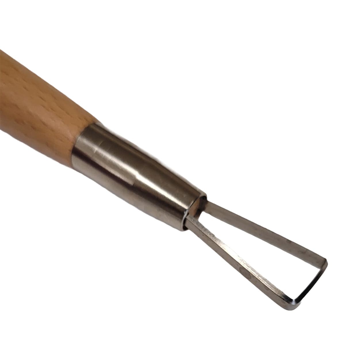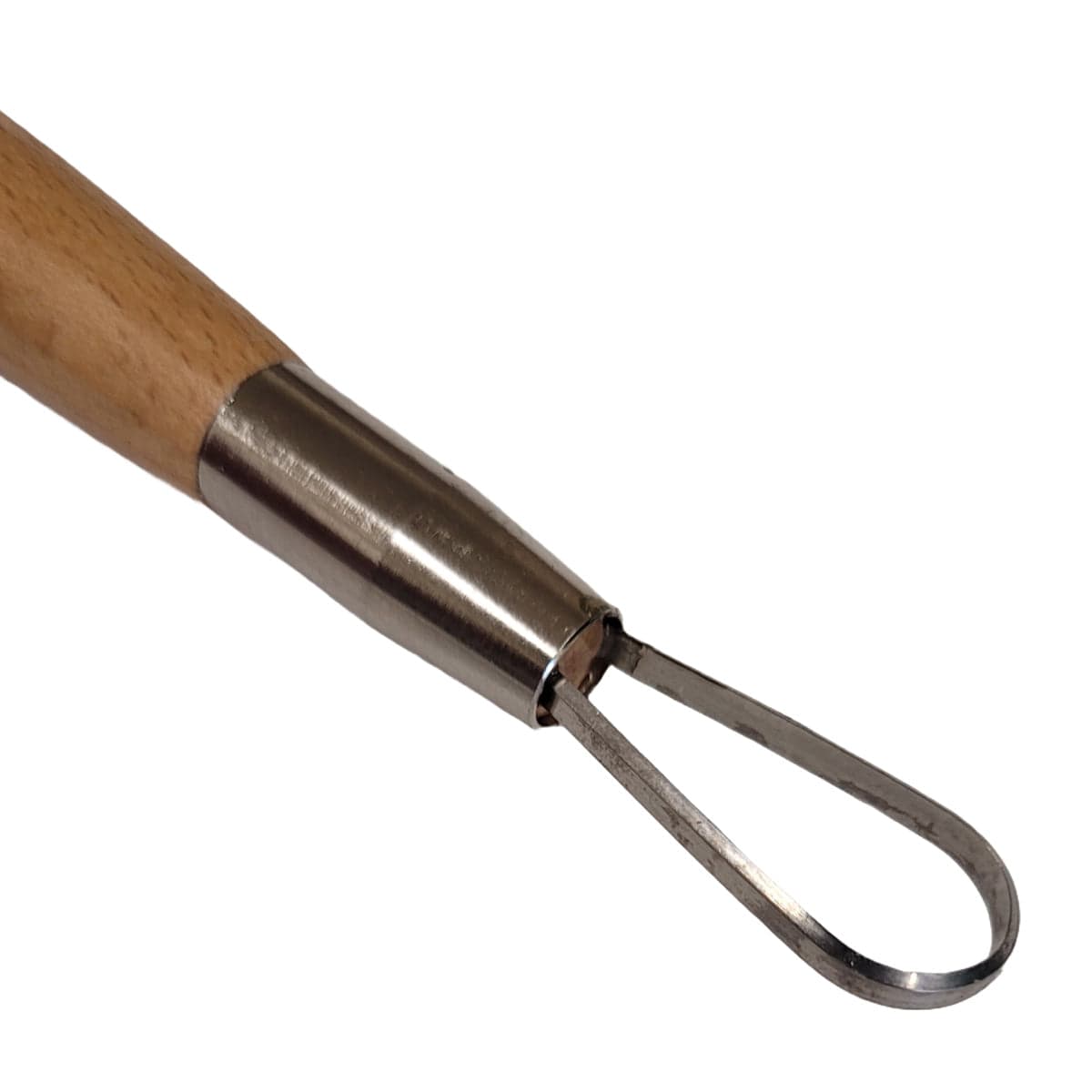 The ribbon tool has cutting loops made of flattened metal ribbons with sharpened edges. Ribbon tools are used for cutting, shaping, trimming and hollowing both wheel-thrown and sculptural forms. This tool consists of a smooth hardwood handle with 1/8" wide high-strength stainless steel ribbons held firmly by steel ferrules. Suitable for medium-duty cutting work.