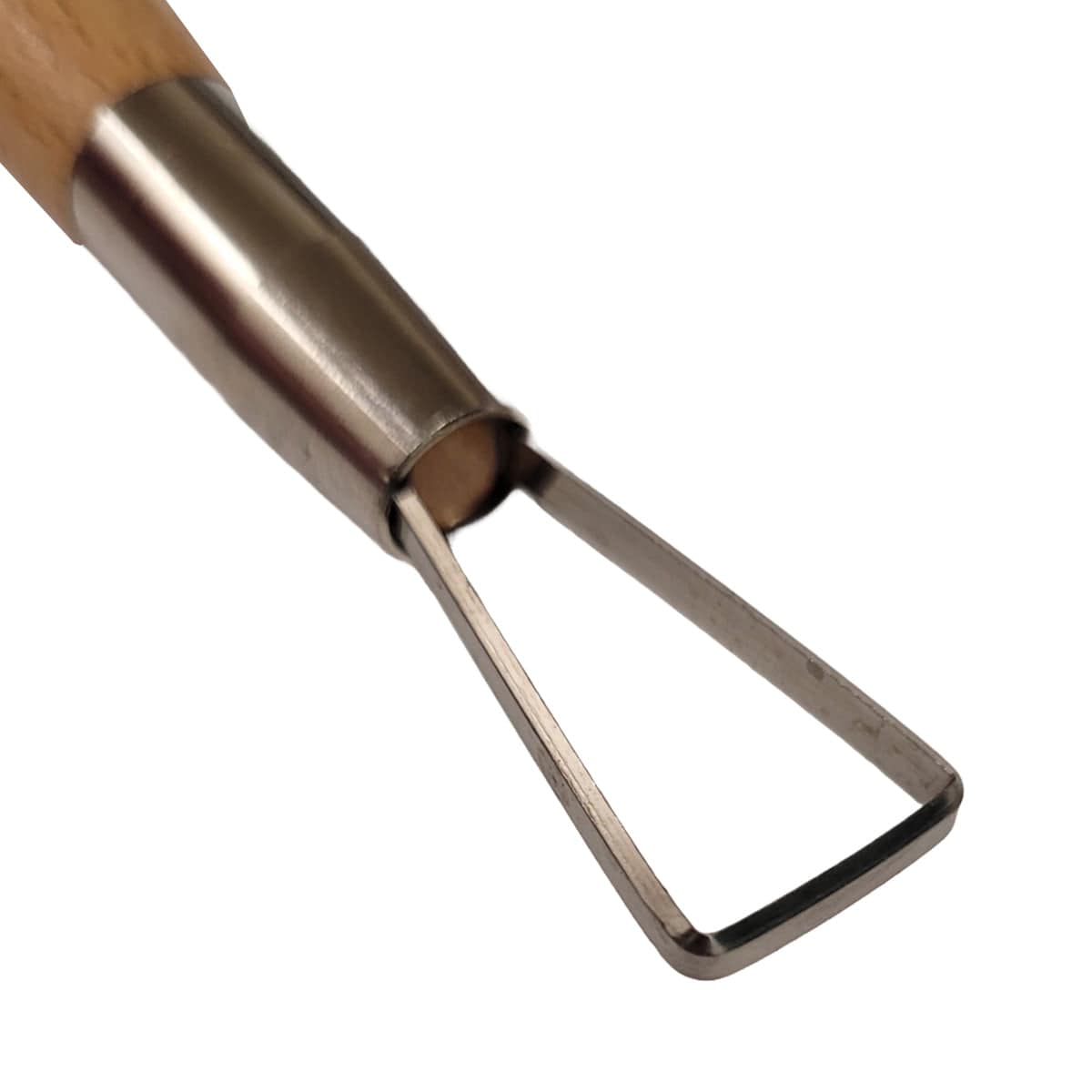 This tool consists of a smooth hardwood handle with 1/8" wide high-strength stainless steel ribbons held firmly by steel ferrules. This is a 7-1/2" long tool with 1/2" wide loops. Suitable for medium to heavy duty cutting work.