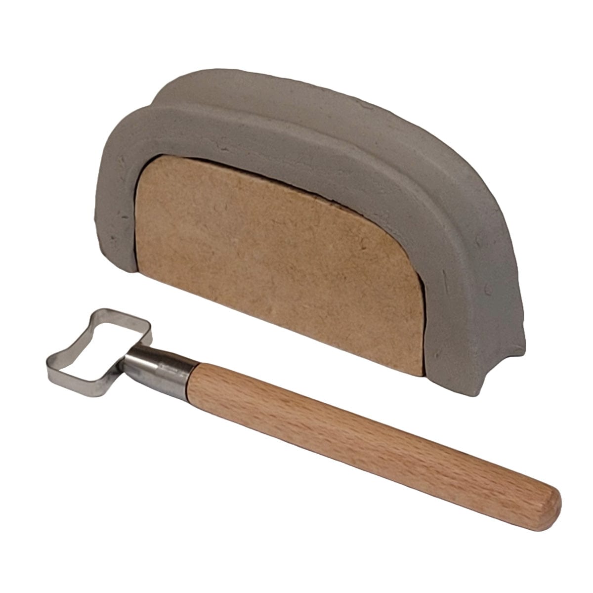 These handle makers feature wooden handles and ribbon loops which create additional compression on the clay when drawing through a block of clay. Makes a handle 7/8 inch wide.