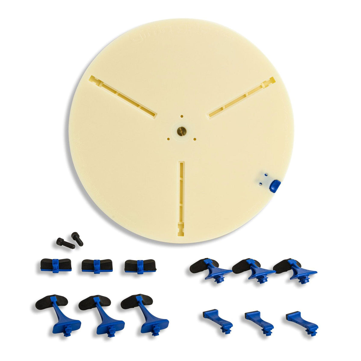 The Giffin Grip Mini attaches to the wheel head with bat pins (both 6” and 10” wide pin spacing). The Mini is much lower profile than the Model 10 so your trimmings will stay in your splash pan! It also locks down once you’ve centered your pot so that it doesn’t loosen/tighten while you’re trimming. You can trim pieces starting at 5/8” in diameter all the way up to 9.5” in diameter.
