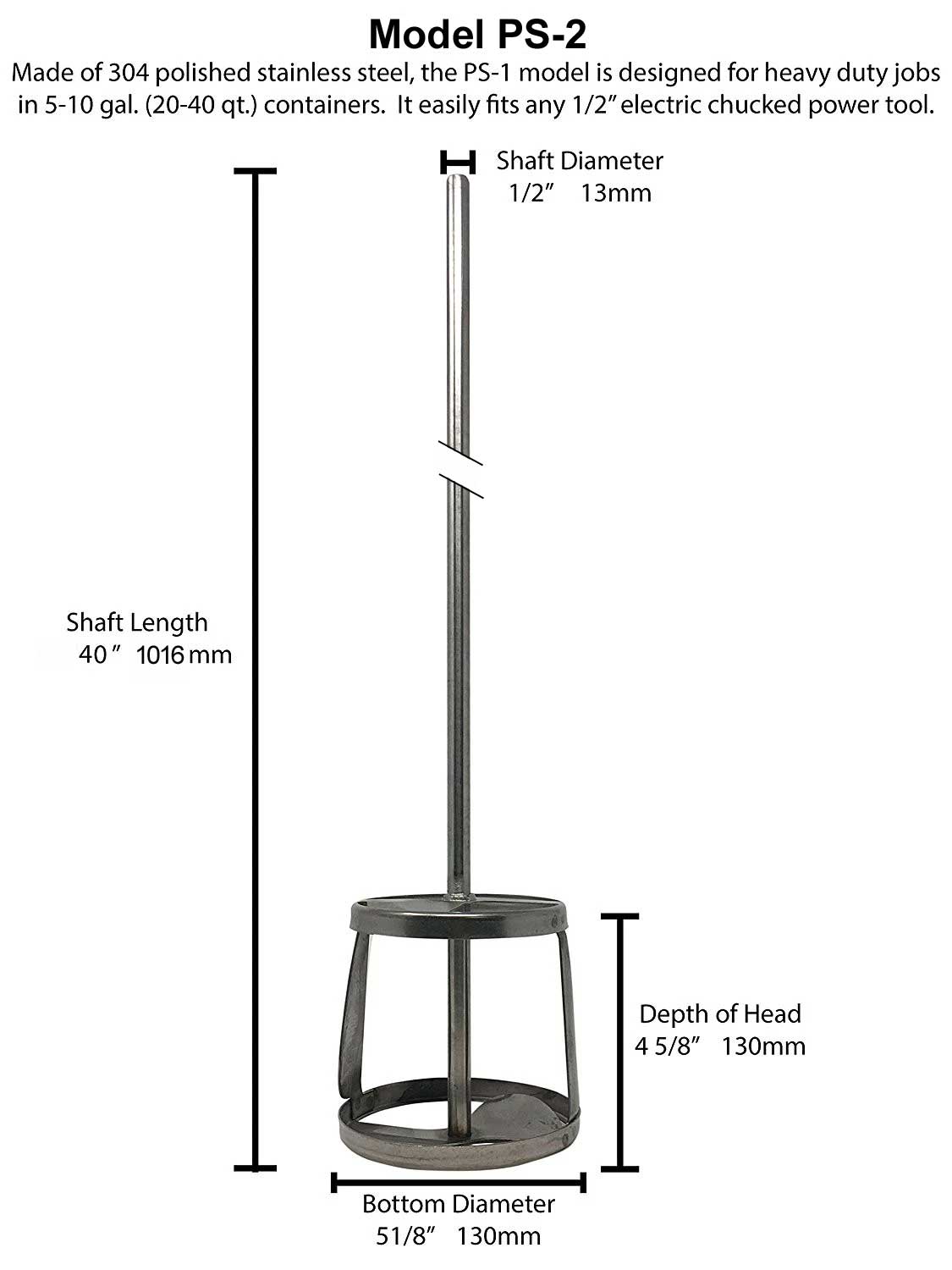 The Jiffy Mixer model PS-2 stainless steel mixing blade attaches to a power drill to mix quantities of liquids between 10 and 50 gallons. Shaft Diameter - 1/2", length - 40", head diameter - 5 1/8"