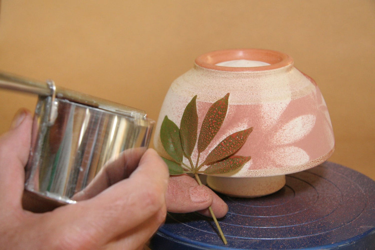 This is one of the most efficient glazing tools you'll ever use. This traditional Japanese oral spray tool is simple to use and only requires a gentle blowing from your mouth. You will broaden your decorating techniques repertoire as you build multiple slip and glaze surfaces onto your work. Spot spray or feather layers of glaze onto the shoulder of a pot, at the foot, or subtly highlight knobs and handles. Spray over glaze mistakes and unwanted finger marks. Spray slip or glaze over paper or cardboard silhouettes; or patch-spray an organized or random pattern across or around a pot. Rather than dip or pour glaze over that large pot, spray it! Use your water-filled spray-can to mist and dampen leather-hard works in progress. No more worn-out pump bottles to deal with! For extensive layered applications, have several spray cans loaded and on hand. Lightly pressure each can, in turn, onto your compressor nozzle to quickly change colors - without the hassle of constantly cleaning up spray guns and bottle containers! The no-clog design allows for hours of efficient spraying. These spray cans clean up easily by just rinsing under running water. Remember, if the glaze is too thick, you won’t be able to spray it. Thinner glazes work best, so you may need to apply more than one coat. These spray cans clean up easily by just rinsing under running water.