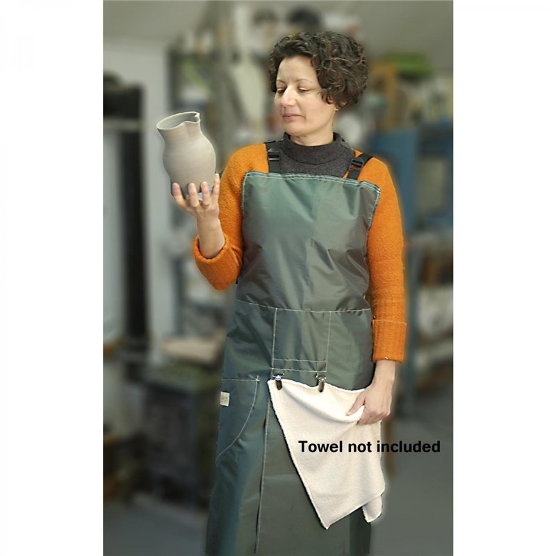 PotAprons are made of light, water-resistant, durable materials. The straps are fully adjustable, and a clever clip design means that you have the advantage of secure crossover straps without the hassle. The split-leg design allows you to sit comfortably at the wheel while potting, with legs properly protected from clay and moisture. There is a deep pocket to the right and a towel can be attached to the left. Towels are secured by three clips for easy removal and replacement. After a day at the wheel PotAprons can be wiped clean or rinsed. They dry quickly. No more intensive drying overnight or that feel of a still-damp apron in the morning!
