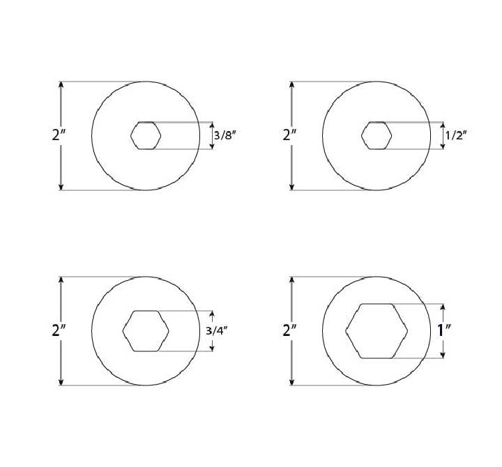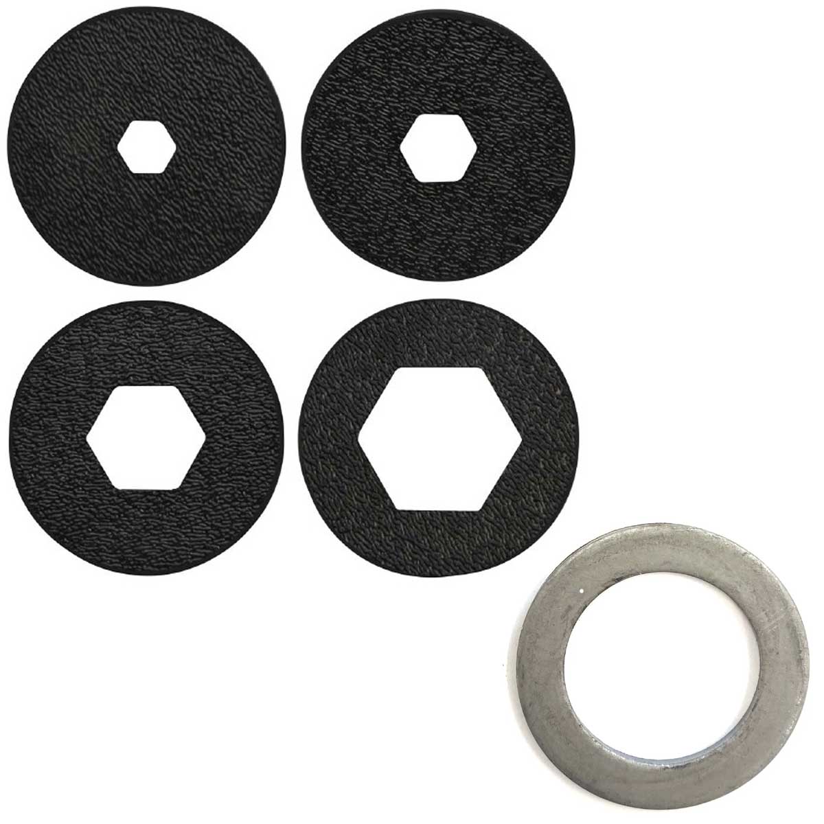 4 piece hexagon die set that requires the use of the included metal washer pictured to fit the 2" diameter Frema Hand Held Extruder and Kemper IKEG Hand Held Extruder.