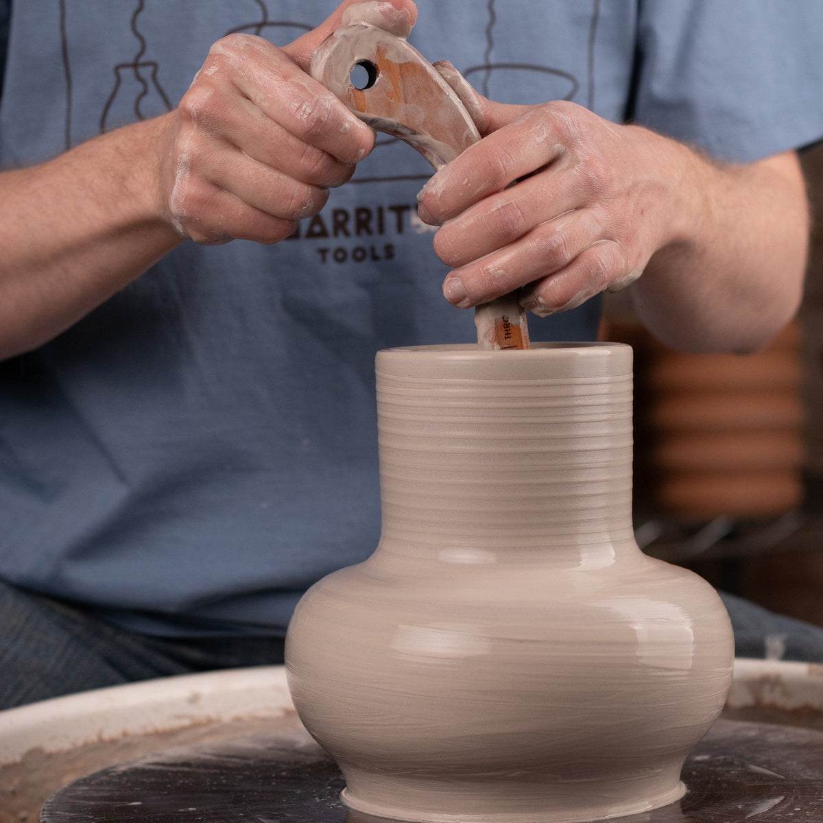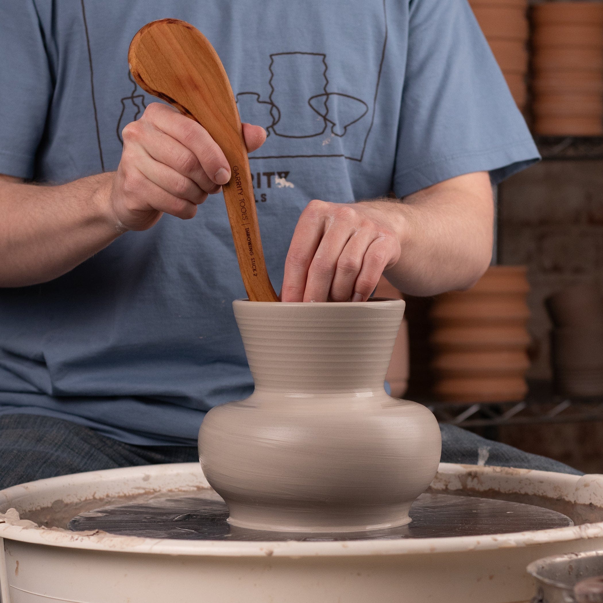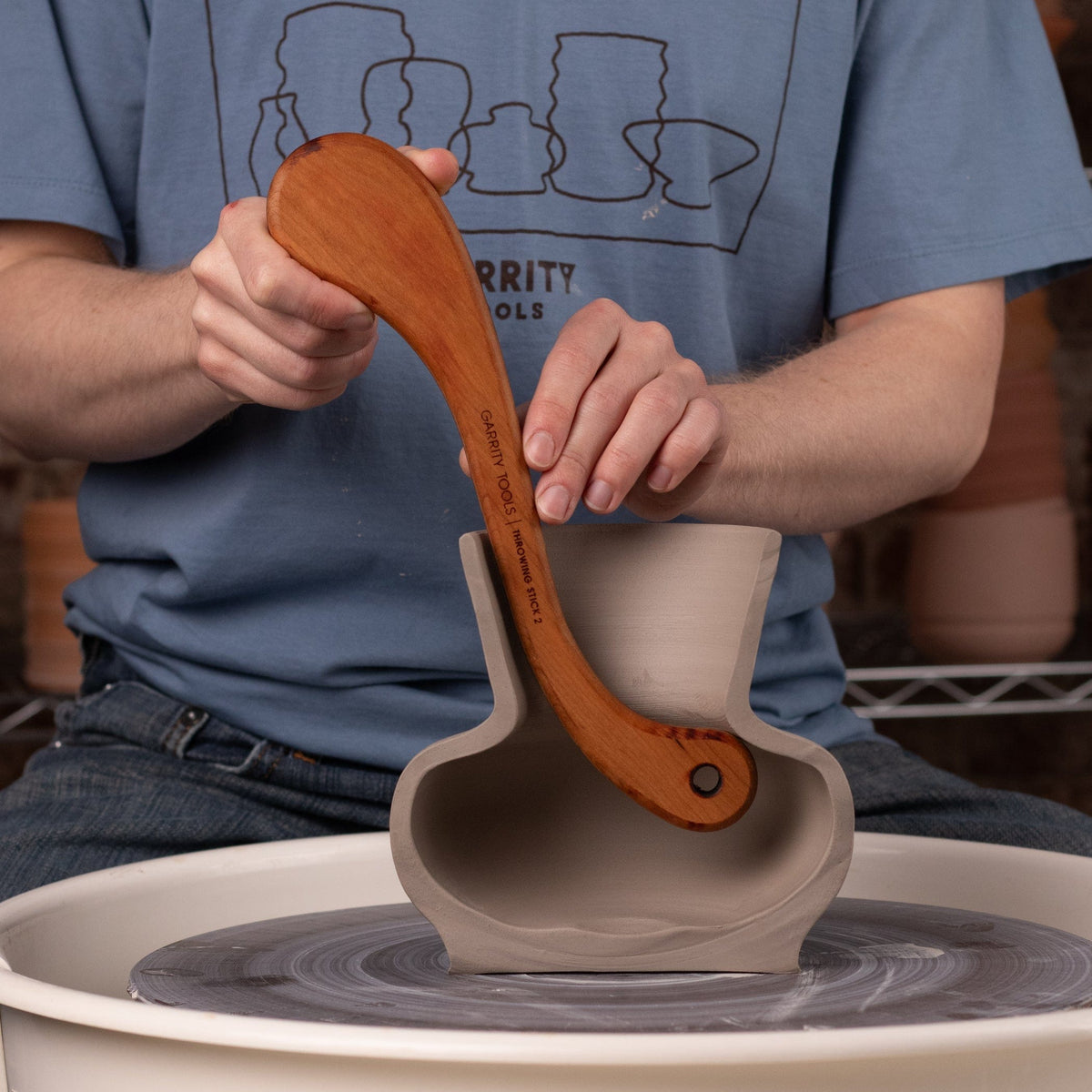 Garrity's Throwing Stick 2 is designed for easy gripping while you use it to expand and shape narrow-mouthed vessels. Drop it into a tall thin cylinder and gently press the head of the Throwing Stick against the lower walls to create round forms. With this tool, you can change the form of your vessel from the inside while retaining exterior textures and details. The shape of the head was tested and perfected for stretching clay in many directions and will assist you in pulling your walls straight up or pushing them out wide.