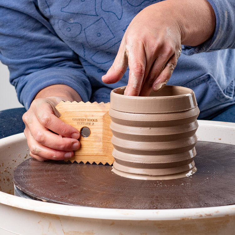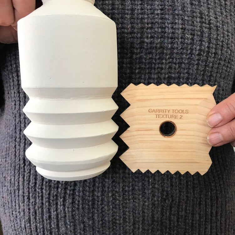 Texture 2 helps you create pointed ridges that are deep, shallow, small or medium. Each side of Texture 2 provides a different pattern that allows you to make a unique yet consistent texture on your vessel or slab and develop new forms in your work.