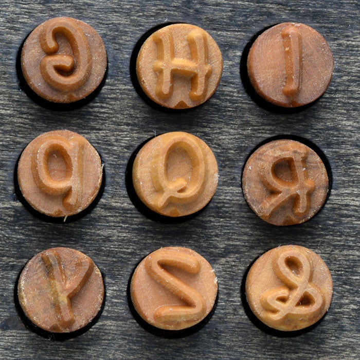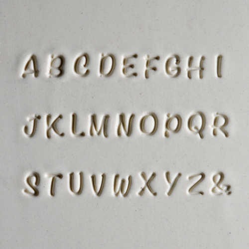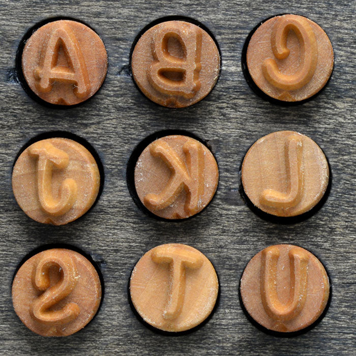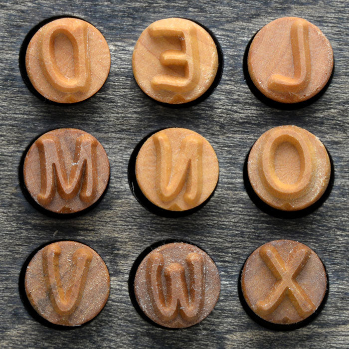 Mom's Fridge Notes Upper Case Font Sets are 1.5 cm (0.6 inches) in diameter. The actual letter varies in size with each stamp. The font stamps can be used to create patterns on any soft medium, including natural clay. Each stamps set includes 26 Upper Case stamps and an ampersand. Each stamp has a small notch at the bottom of each letter to help make it easier to align the stamp. Each stamp is beautifully bevel carved to make deep impressions and aid in releasing easily from the clay. All stamps are finished with tung oil to give them durability and many years of use.