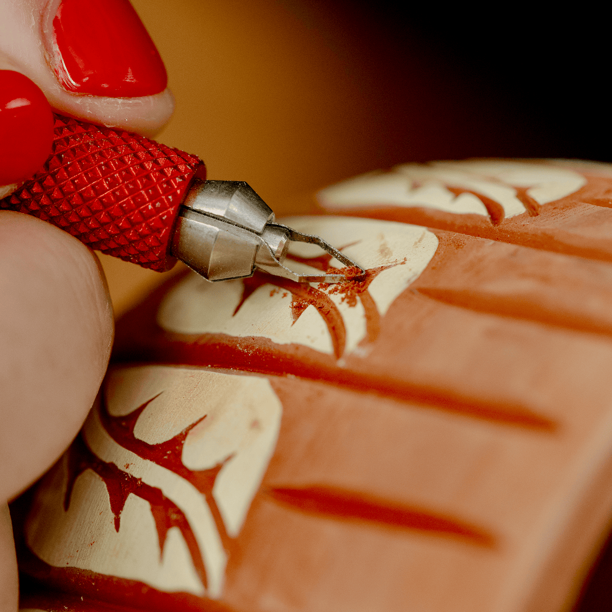 The small pointed blade is ideal for outlining and most detailed sgraffito work. It has a ~1 mm pointed tip that tapers outward at a 45° angle, allowing for varied stroke widths depending on the depth of your cut. When tilted, the side of the blade can also be used to clear or remove a larger surface area.