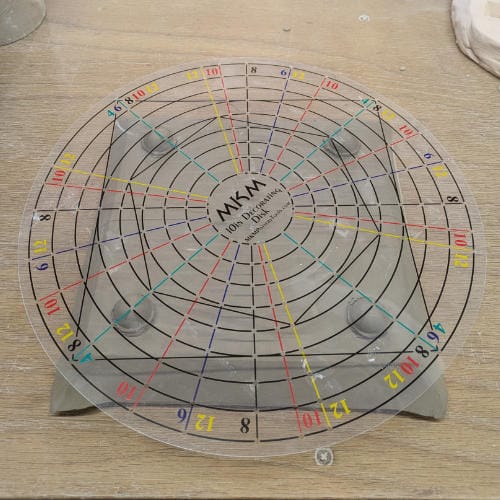 The MKM Decorating Disks™ for Clay is a pair of two sturdy flexible transparent sheets. Each Decorating Disk has its own even or odd segmented divisions. Use the concentric circles to quickly center your piece. Colored radial lines indicate even divisions, (2, 4, 6, 8, 10, 12) on one decorating disk and odd divisions, (3, 5, 7, 9) on the other decorating disk. The secret is the holes. Along the radial lines are holes that allow a potter to mark through the decorating disk to the soft, leather hard, or bisqued clay. Place an MKM Decorating Disk on top of, (or underneath) the pot, center it and mark through the holes to the clay.