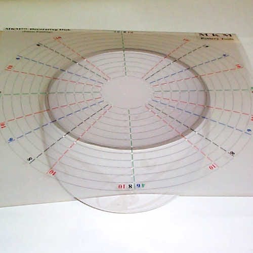 The MKM Decorating Disks™ for Clay is a pair of two sturdy flexible transparent sheets. Each Decorating Disk has its own even or odd segmented divisions. Use the concentric circles to quickly center your piece. Colored radial lines indicate even divisions, (2, 4, 6, 8, 10, 12) on one decorating disk and odd divisions, (3, 5, 7, 9) on the other decorating disk. The secret is the holes. Along the radial lines are holes that allow a potter to mark through the decorating disk to the soft, leather hard, or bisqued clay. Place an MKM Decorating Disk on top of, (or underneath) the pot, center it and mark through the holes to the clay.
