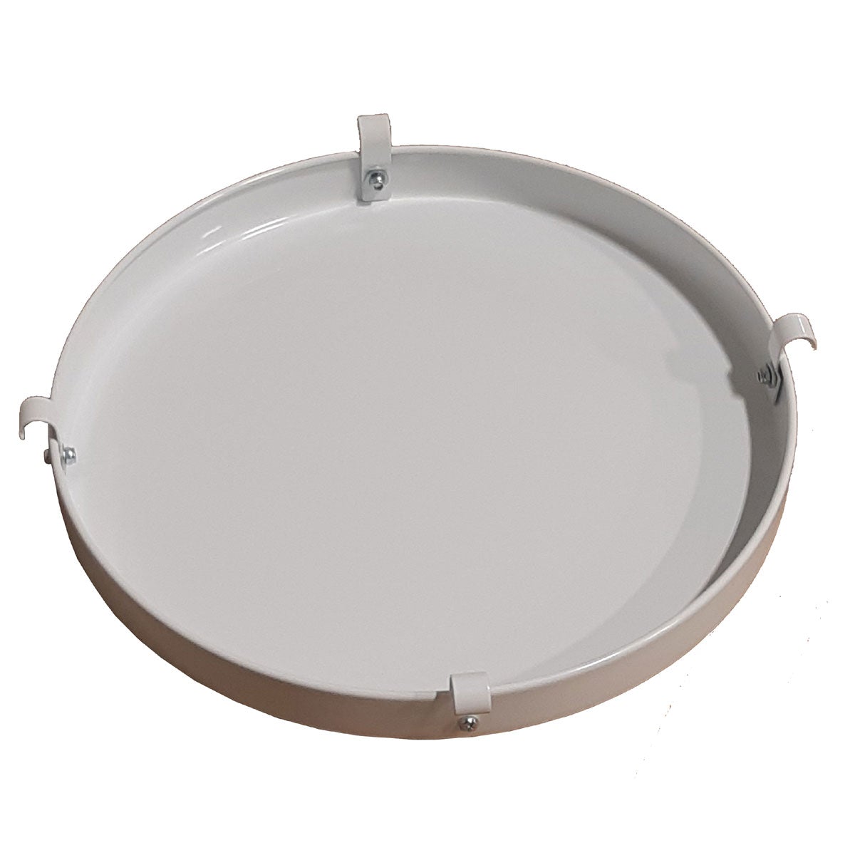 Frema's tool tray is made to fit the Adjustable Stool. It's made of metal and painted white to match the stool. It comes with four brackets that connect it to the lower support bar of the stool. The tool tray measures 14 inches in diameter and is 1.5 inches deep.