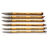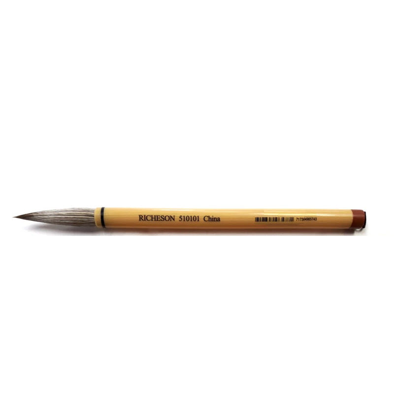 If an artist is familiar with a Chinese Brush, the chances are that it is this style. Designed originally for lettering, the original concept is that only the tip is used when applying color. Made with horse hair. The handle is bamboo and traditional in appearance.