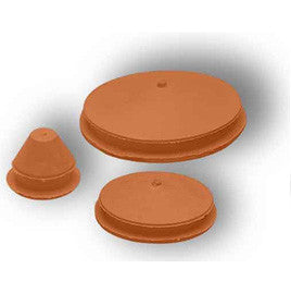 Flexible red rubber stoppers come in a range of sizes. Used to plug holes for piggy banks, salt & pepper shakers, etc.